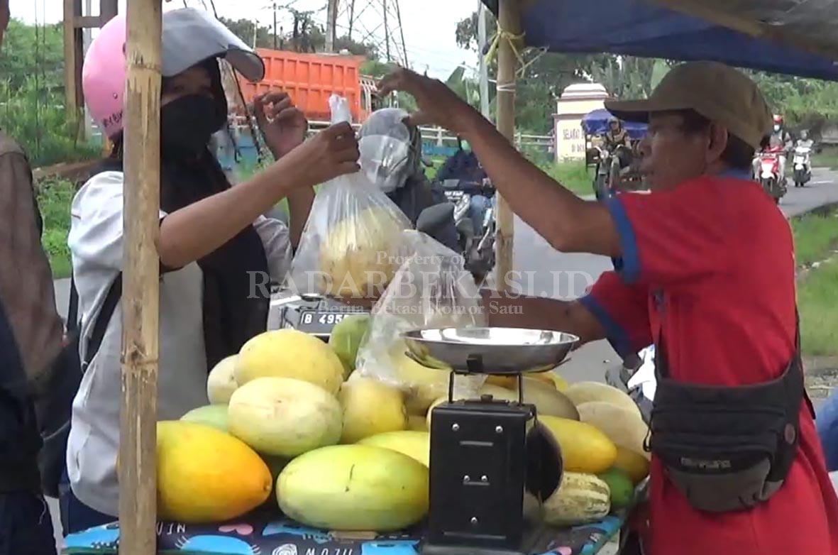 LAYANI PEMBELI: Pedagang timun suri melayani pembeli yang melintas di Jalan Inspeksi Kalimalang, Desa Sukadanau, Kecamatan Cikarang Barat, Kabupaten Bekasi, Kamis (30/3). PRA/RADAR BEKASI