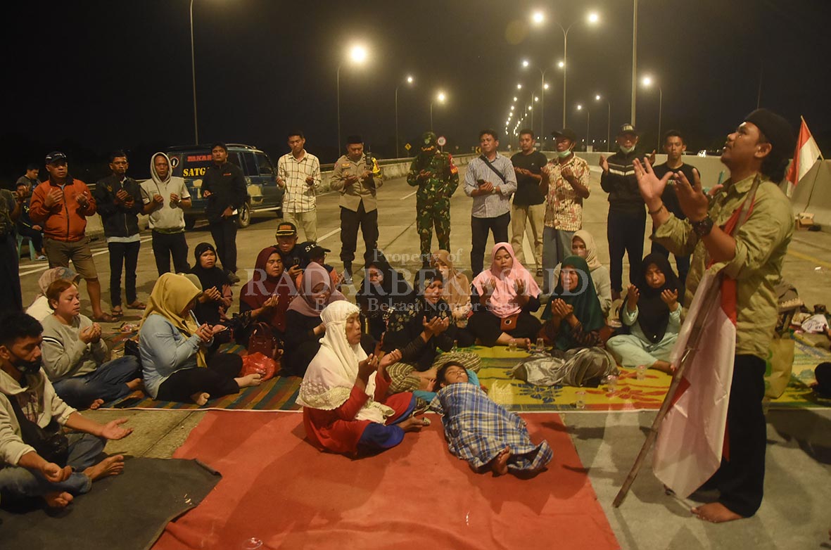 DOA BERSAMA: Para ahli waris menggelar doa bersama saat aksi menuntut ganti rugi lahan di Tol Cimanggis - Cibitung Ruas Tol Jatikarya, Senin (10/4). Mereka akan tetap blokade jalan hingga tuntunan pembayaran ganti rugi dipenuhi. RAIZA SEPTIANTO/RADAR BEKASI