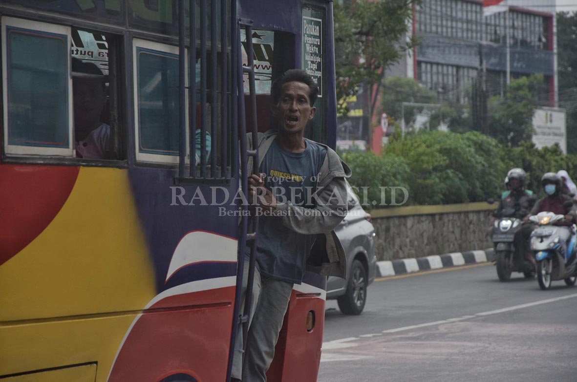 ANGKUTAN UMUM: Seorang kenek angkutan umum menggantung di pintu saat melintas di Jalan Raya Imam Bonjol, Cikarang Barat, Kabupaten Bekasi, Kamis (27/4). ARIESANT/RADAR BEKASI
