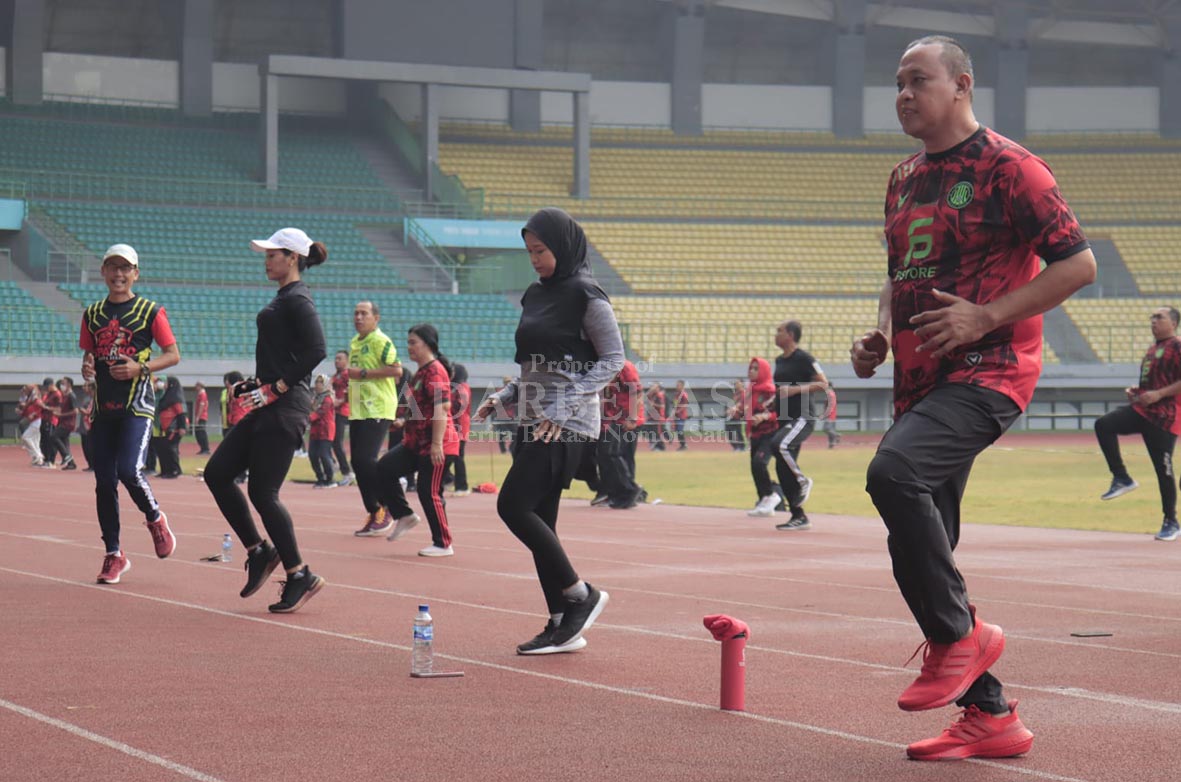 SENAM: Plt Wali Kota Bekasi, Tri Adhianto ketika mengikuti Senam Sparco bersama jajarannya di Stadion Patriot Candrabhaga Kota Bekasi, Selasa (9/5). IST/RADAR BEKASI
