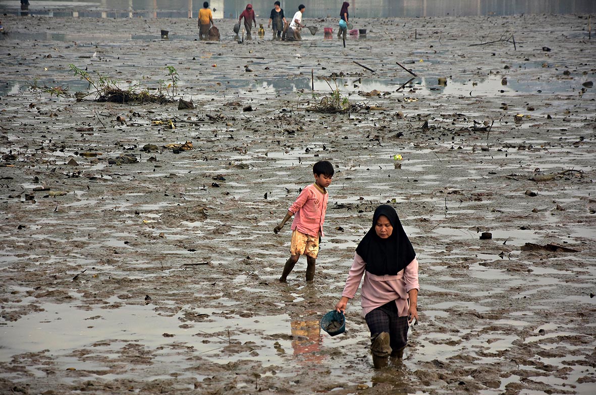 “Niatnya saya mau olahraga pagi dengan anak, eh liat warga pada nyari kerang, ada yang dapet ikan juga, saya pulang lagi ngambil plastik buat naro kerang. Anak saya ngikut lagi. Kebetulan saya sekeluarga doyan kerang. Ini anak ngikut seneng banget main lumpur sambil nyari kerang,” tuturnya.