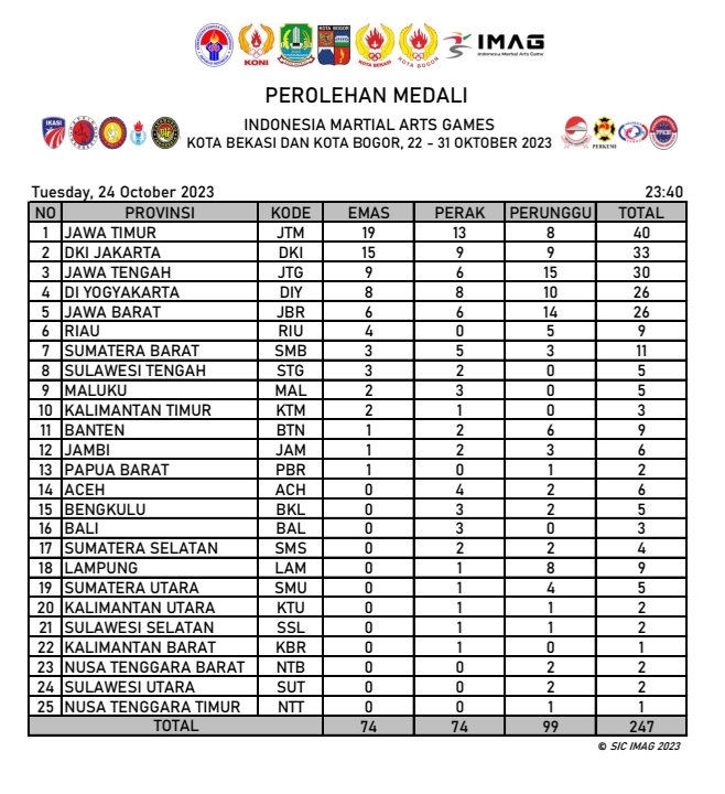 RADARBEKASI.ID, BEKASI -Kontingen Jawa Timur berada di posisi puncak dalam daftar sementara perolehan medali Indonesia Martial Arts Games (IMAG) I 2023 Kota Bekasi-Kota Bogor, hingga Selasa (24/10/2023).