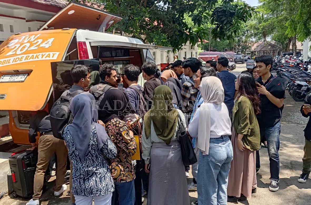 RADARBEKASI.ID, BEKASI – Ratusan mahasiswa Universitas Singaperbangsa Karawang (Unsika) memadati Mobil Ide Rakyat untuk memberikan aspirasinya terkait pemilu 2024.