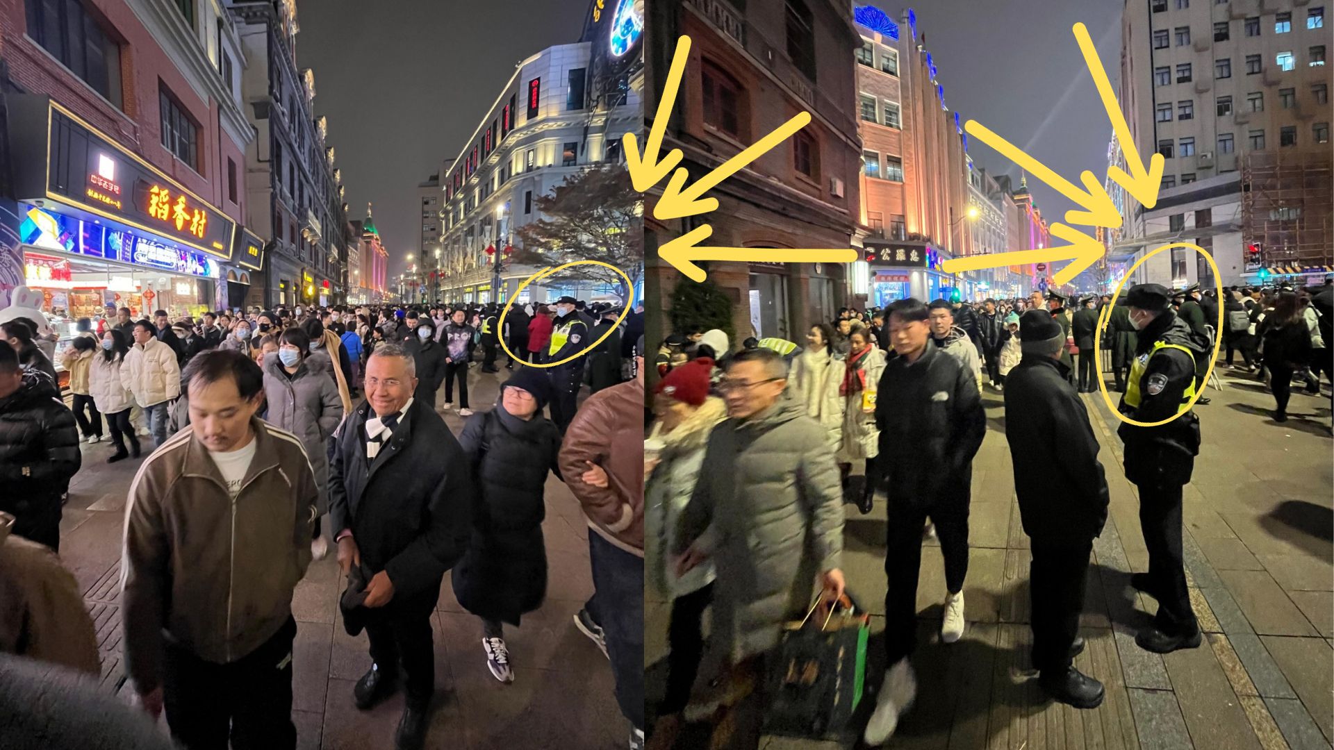 Malam kemarin jalan Nanjing Timur dibelah dua: sisi selatan untuk pejalan kaki menuju sungai. Sisi utara untuk yang kembali dari sungai.