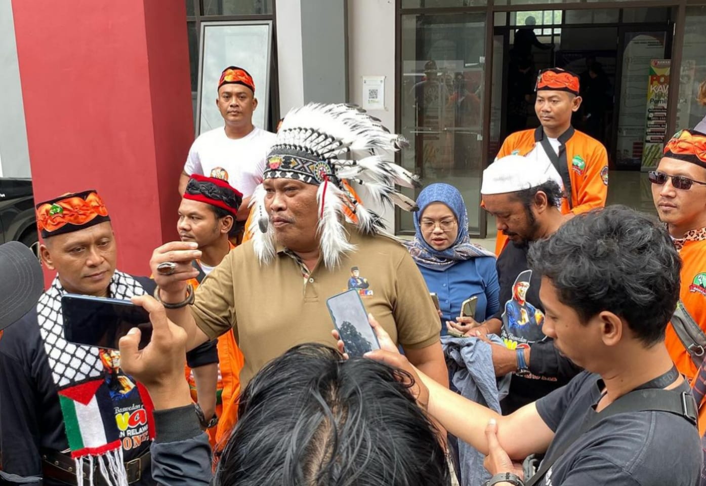 Ketua Umum Jawara Jaga Kampung (Jajaka) Nusantara, Damin Sada, memberikan keterangan kepada wartawan saat mendatangi kantor Bawaslu Kota Bekasi, Jumat (5/1/2024). BAWASLU KOTA BEKASI