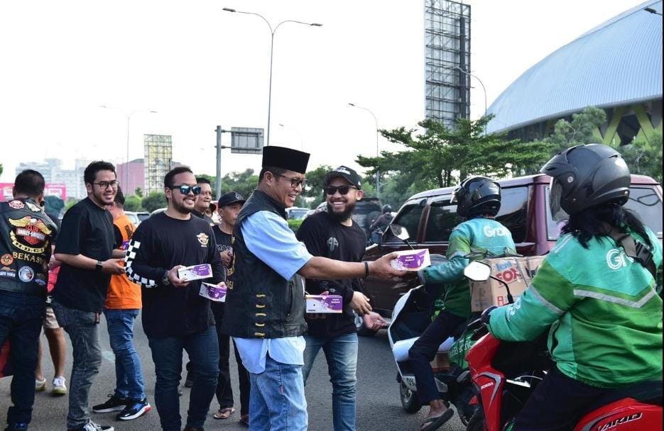 Pengurus dan aggota HDCI membagikan takjil kepada pengendara di Jalan Ahmad Yani Kota Bekasi. FOTO: HDCI Bekasi