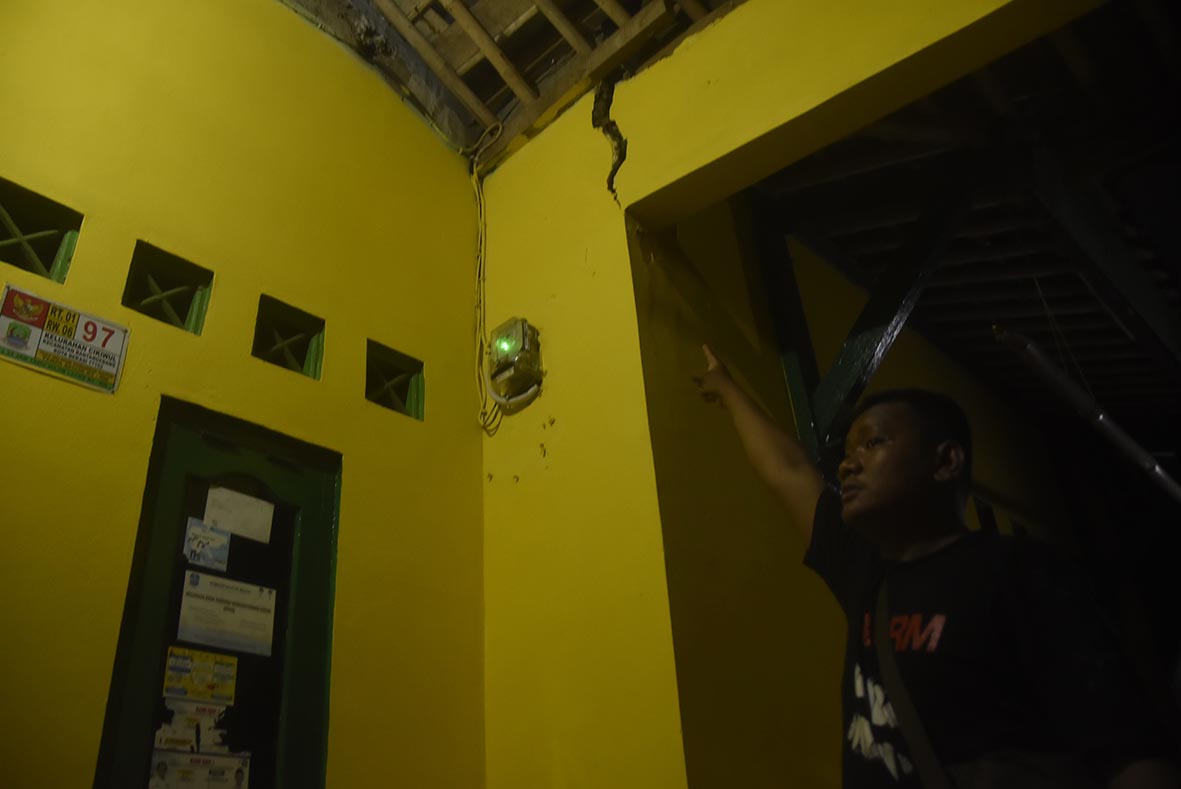 RUMAH RUSAK : Warga menunjukan rumah rusak imbas terkena getaran ledakan Gudmurah Kodam Jaya di RT01/RW06 Kelurahan Cikiwul, Bantargebang. RAIZA SEPTIANTO/RADAR BEKASI