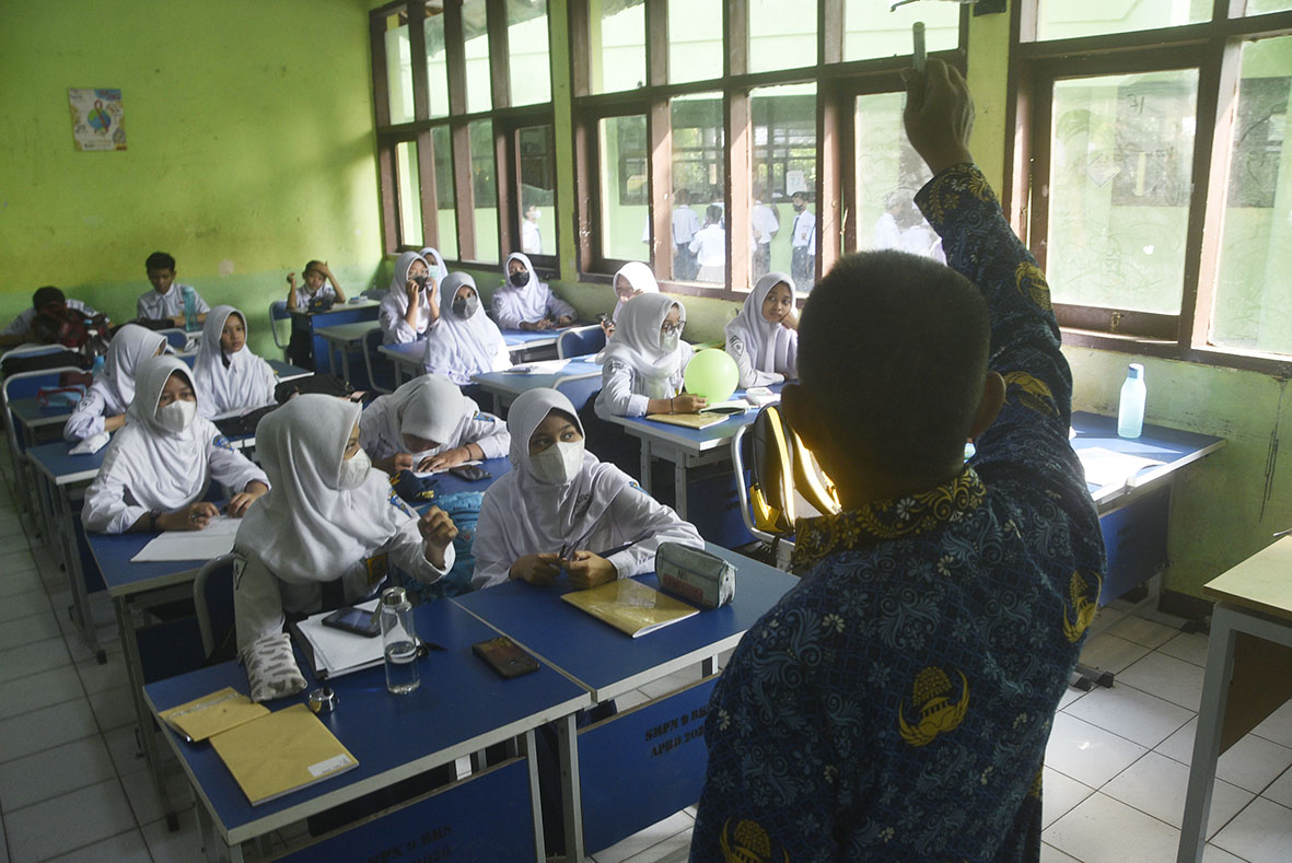 BELAJAR: Guru memberikan materi pembelajaran di hari pertama masuk Sekolah di SMP N 9 Kota Bekasi, beberapa waktu lalu. RAIZA SEPTIANTO/RADAR BEKASI