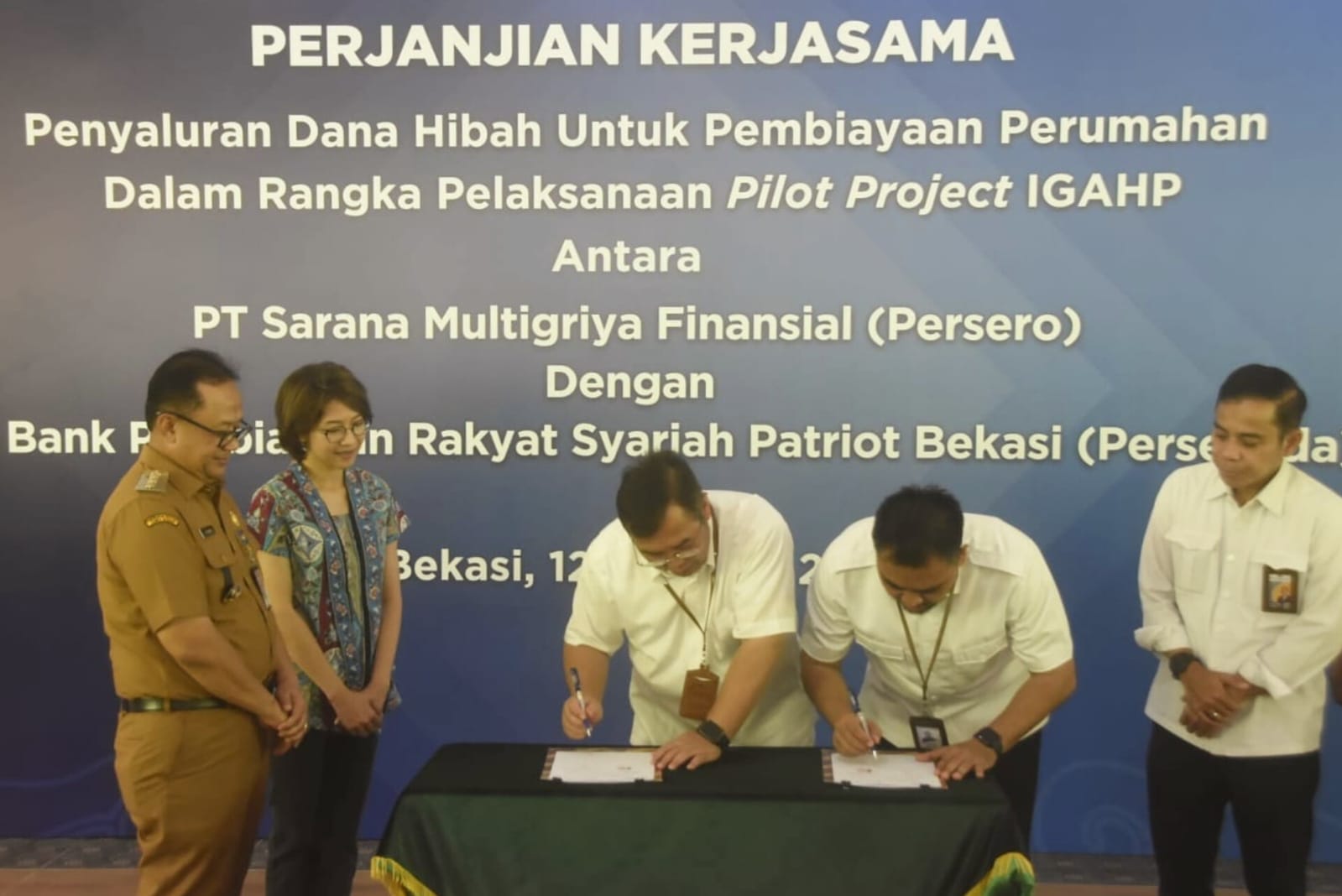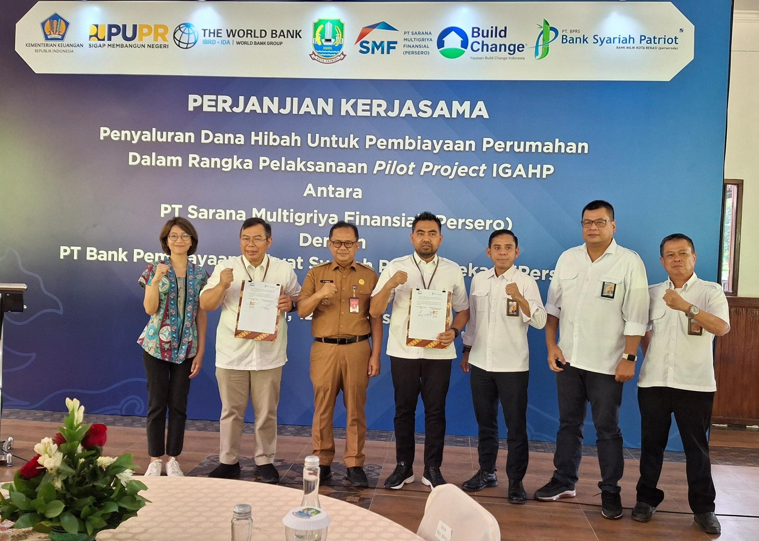 RADARBEKASI.ID, BEKASI – PT Sarana Multigriya Finansial (Persero) atau SMF dan PT Bank Syariah Patriot (Perseroda) atau BPRS Patriot melaksanakan penandatanganan perjanjian kerja sama penyaluran dana hibah untuk pembiayaan perumahan dalam rangka pelaksanaan pilot project “Indonesia Green Affordable Housing Program (IGAHP)” yang diberikan oleh Lembaga Internasional Build Change. Program rumah hijau yang terjangkau ini menyasar masyarakat berpenghasilan rendah (MBR) di Kota Bekasi.