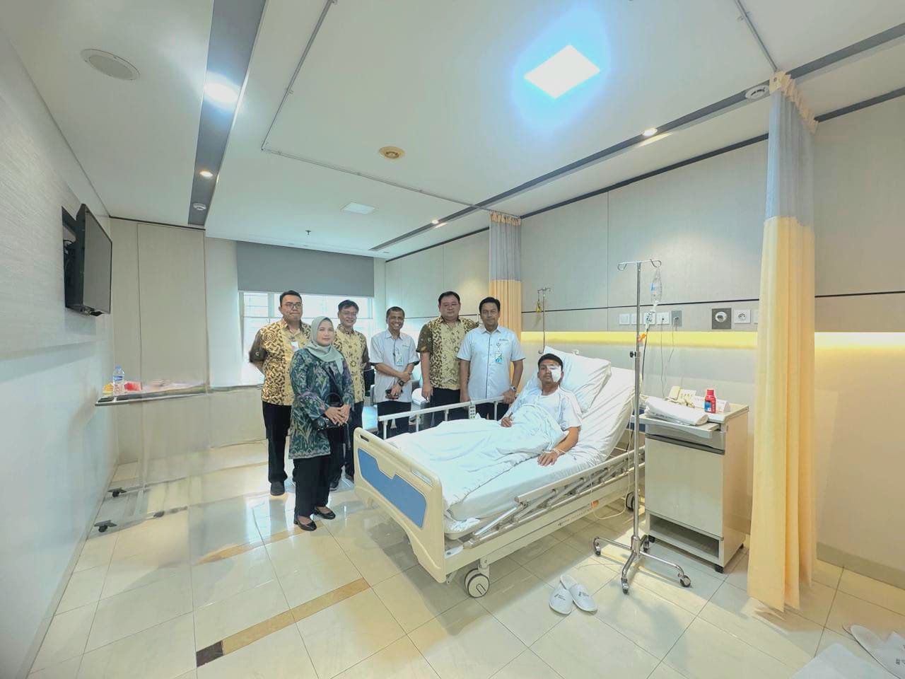 Perwakilan BPJS Ketenagakerjaan Cabang Bekasi Kota bersama Direktur RS Mitra Keluarga Bekasi Timur, dr. Yudistira Wastu Putra, MARS, MM, saat menjenguk Dendy Sulistiawan, pemain Bhayangkara FC, di kamar perawatan. FOTO: ISTIMEWA