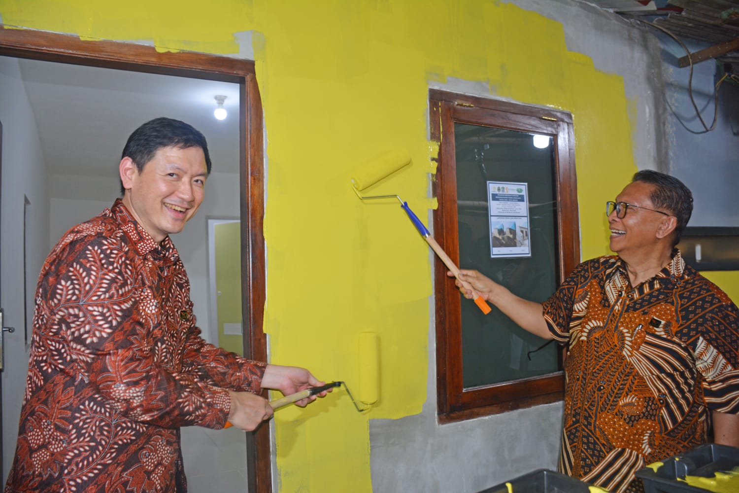 President Director PT Summarecon Agung Tbk, Adrianto P. Adhi, bersama Director PT Summarecon Agung Tbk, Soegianto Nagaria, mengecat rumah saat peluncuran program Bedah Fasilitas Umum dan Renovasi 500 Rumah, Kamis (21/8). FOTO: CORCOMM SUMMARECON
