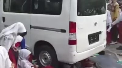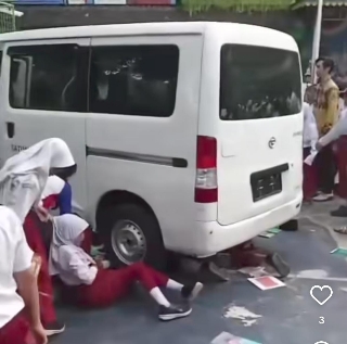 Selain itu, beberapa siswa juga tampak terlindas hingga masuk ke dalam kolong kendaraan, dan darah terlihat berceceran di area lapangan,.