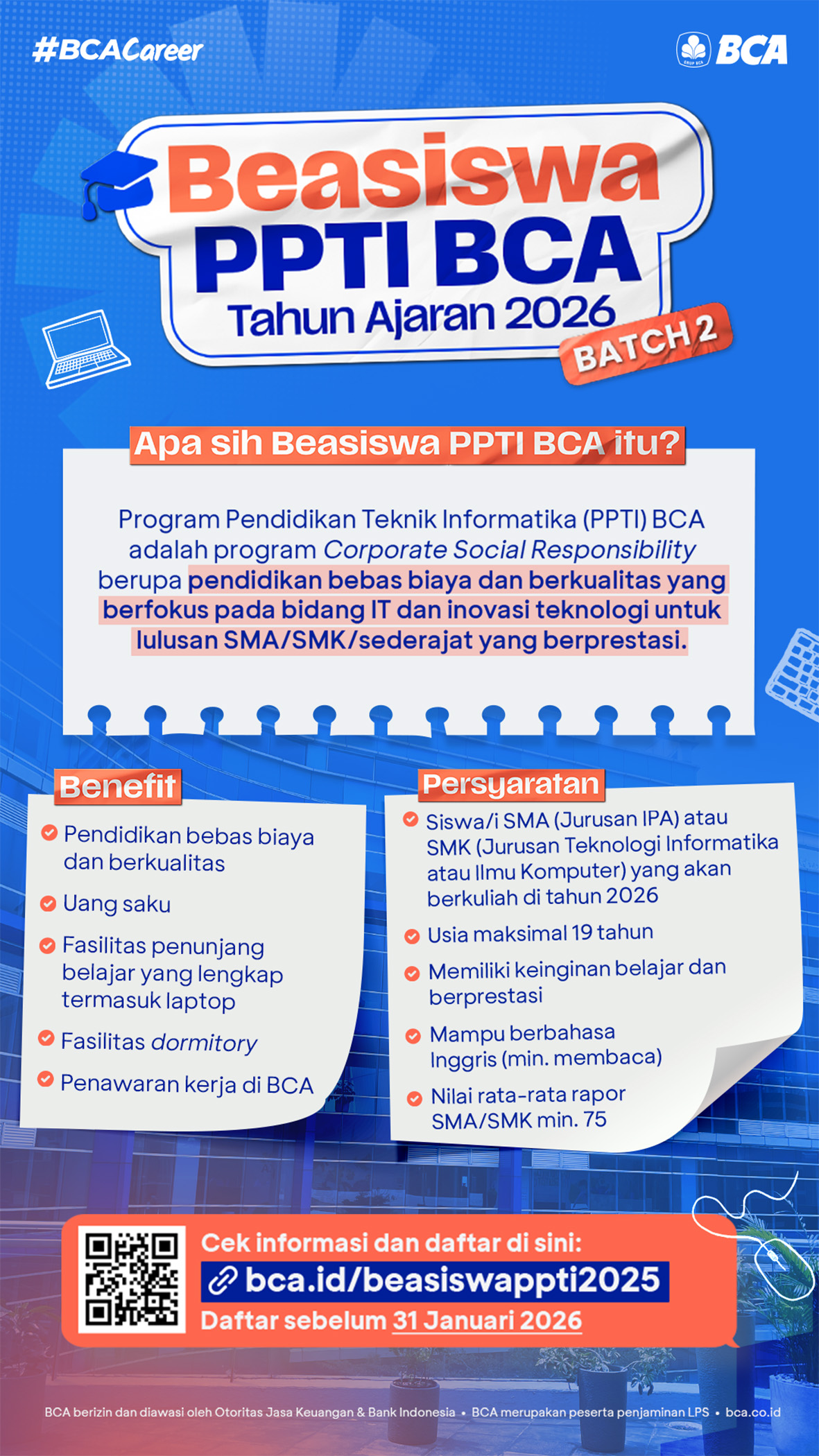 RADARBEKASI.ID, BEKASI – PT Bank Central Asia Tbk (BCA) membuka gelombang kedua pendaftaran Beasiswa BCA Program Pendidikan Teknik Informatika (PPTI) untuk tahun ajaran 2026. Program ini ditujukan bagi pelajar kelas 12, lulusan SMA jurusan IPA, serta alumni SMK jurusan Teknologi Informatika atau Ilmu Komputer yang hendak berkuliah pada 2026. Pendaftaran Beasiswa BCA PPTI batch 2 dibuka hingga 31 Januari 2026.