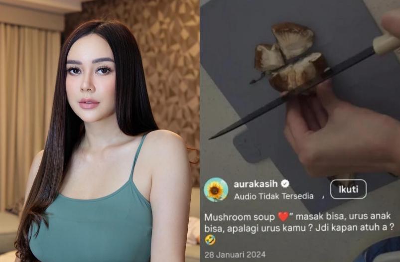 “Mushroom soup. Masak bisa, urus anak bisa, apalagi urus kamu? Jadi kapan atuh a?” tulis keterangan video Aura Kasih.