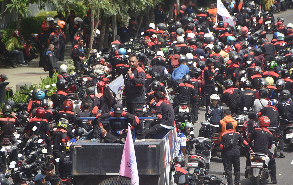 Pantauan Radar Bekasi, massa buruh bergerak menuju Istana Presiden dengan konvoi sepeda motor untuk meminta Presiden Prabowo Subianto menegur Gubernur Jawa Barat agar segera melengkapi penetapan UMSK sesuai usulan pemerintah daerah.