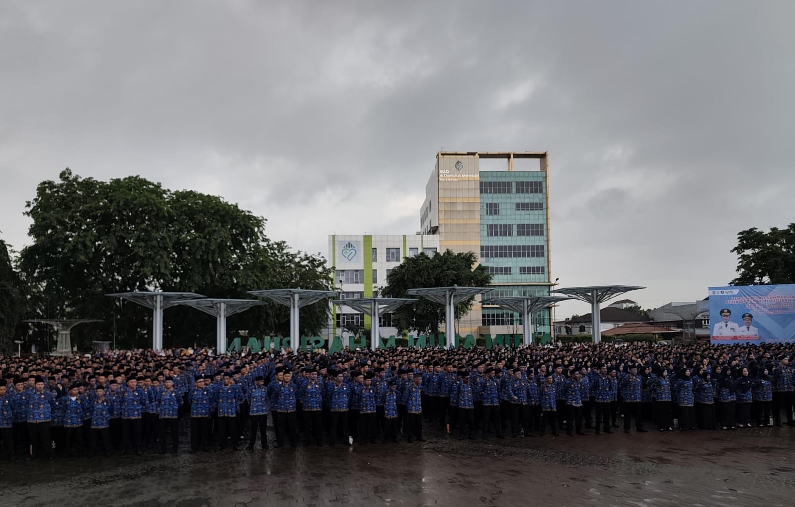 Prosesi pelantikan yang dipimpin Wali Kota Bekasi Tri Adhianto didampingi Wakil Wali Kota Bekasi Abdul Harris Bobihoe berlangsung di bawah guyuran hujan. Ribuan pegawai yang dilantik tampak basah-basahan saat mengikuti seluruh rangkaian acara hingga selesai.