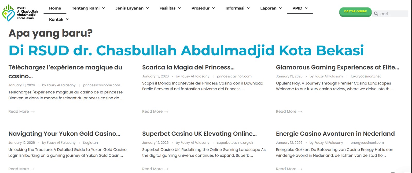 Berdasarkan pantauan pada Selasa (13/1), laman resmi RSUD dr Chasbullah Abdulmadjid justru memuat artikel berbahasa asing dengan topik perjudian daring, seperti casino online dan gaming.