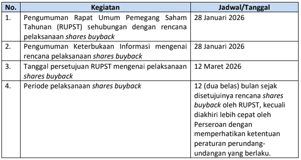 “Periode shares buyback akan dilaksanakan selama 12 bulan sejak disetujuinya rencana shares buyback oleh Rapat Umum Pemegang Saham Tahunan (RUPST) yang rencananya akan dilaksanakan pada tanggal 12 Maret 2026, kecuali diakhiri lebih cepat oleh Perseroan dengan memperhatikan ketentuan dan peraturan perundang-undangan yang berlaku,” ujar Hera F. Haryn, EVP Corporate Communication and Social Responsibility BCA.