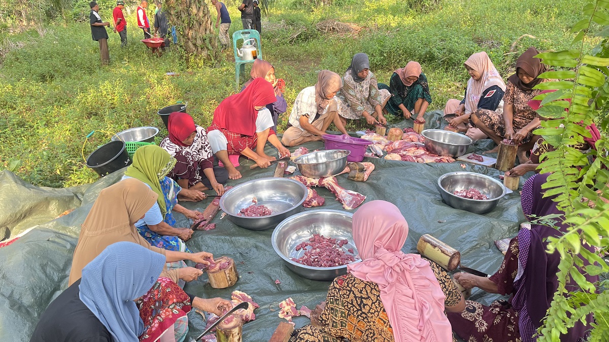 Warga memotong daging sapi untuk dimasak di Kecamatan Sawang, Kabupaten Aceh Utara. FOTO: GERAKAN ANAK NEGERI
