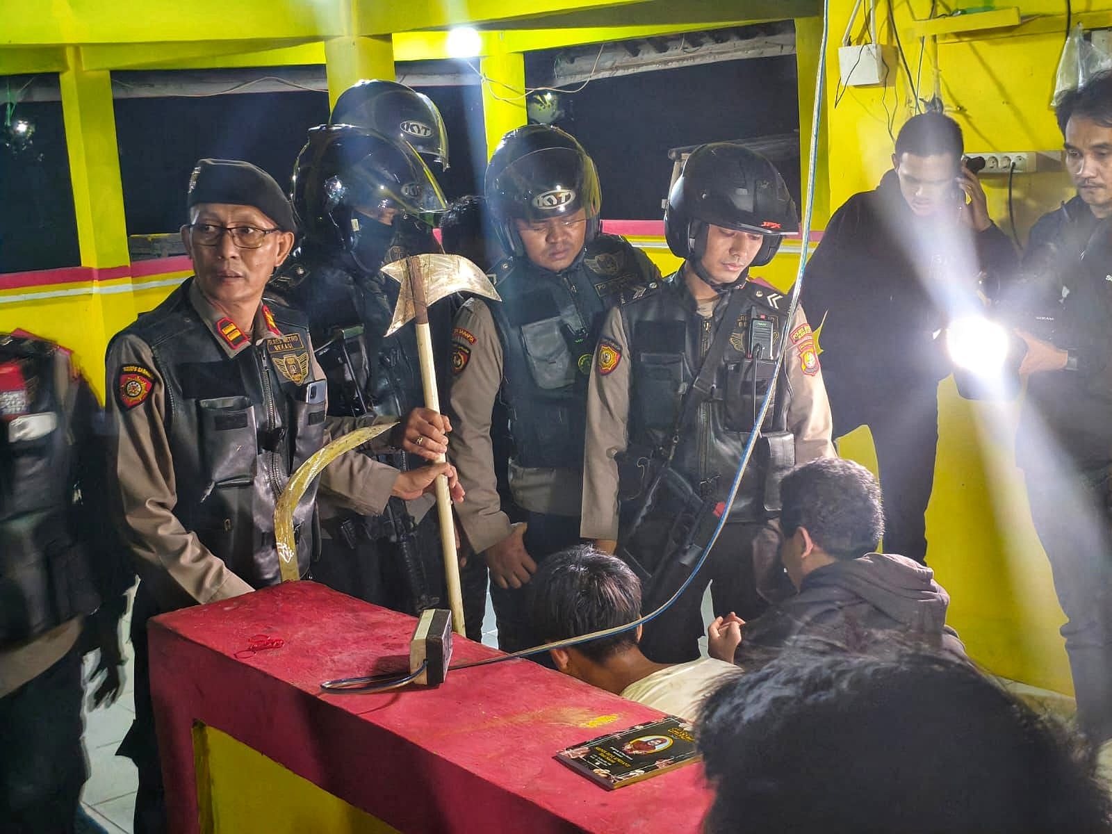 Ia menjelaskan penangkapan bermula saat petugas menyisir kawasan Kampung Kebon Kopi sekitar pukul 03.00 WIB. Warga sekitar sebelumnya telah lebih dulu mengamankan dua remaja yang kedapatan membawa senjata tajam jenis corbek dan sabit panjang atau “pencabut nyawa”.