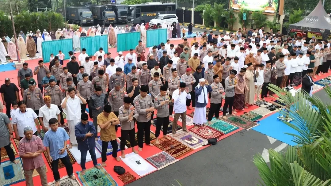Ratusan anggota kepolisian bersama masyarakat sekitar melaksanakan salat Idul Fitri 1447 Hijriah secara berjamaah dengan suasana yang tertib dan penuh kekhusyukan.