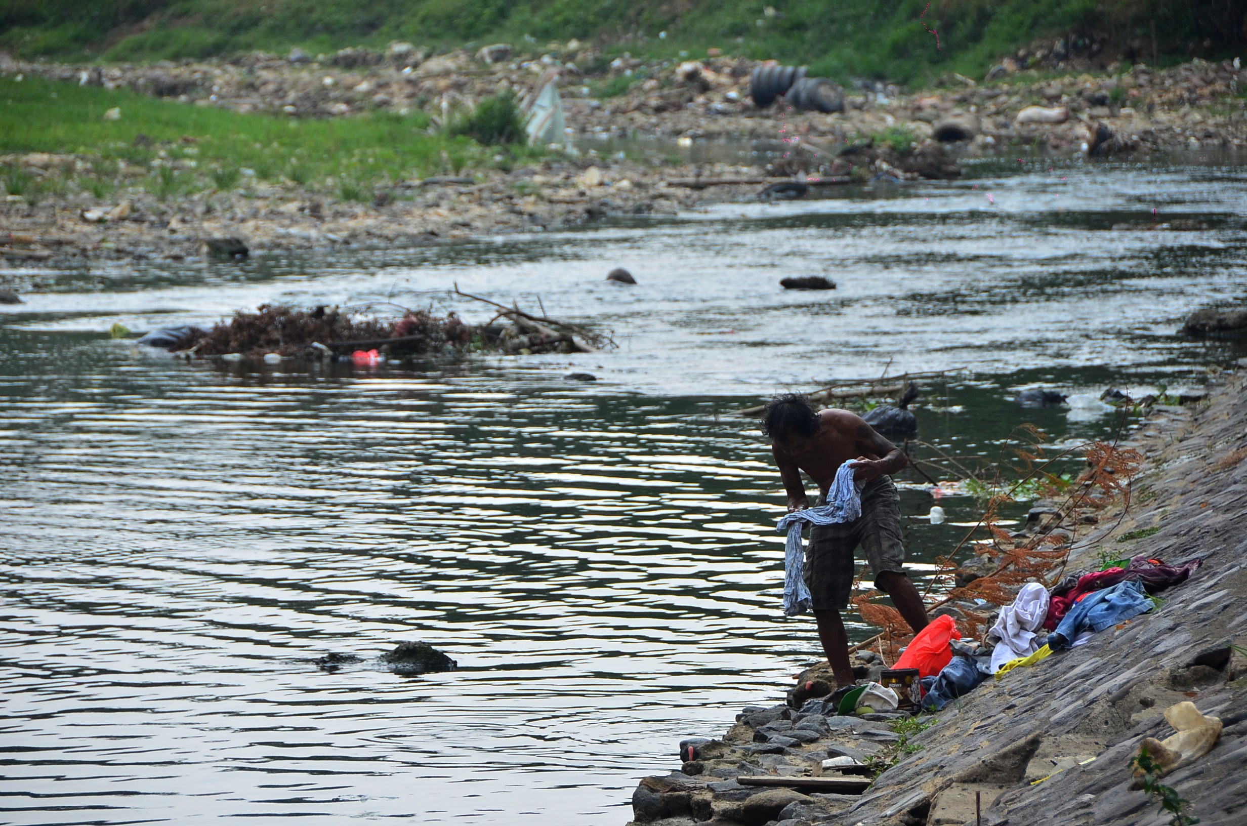 KEMARAU : Warga memanfaatkan aliran Kali Bekasi yang kering untuk mencuci pakaian, belum lama ini. Bekasi diprediksi akan menghadapi musim kemarau yang lebih panjang. RAIZA SEPTIANTO/RADAR BEKASI
