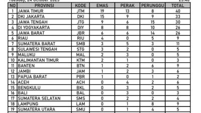 RADARBEKASI.ID, BEKASI -Kontingen Jawa Timur berada di posisi puncak dalam daftar sementara perolehan medali Indonesia…